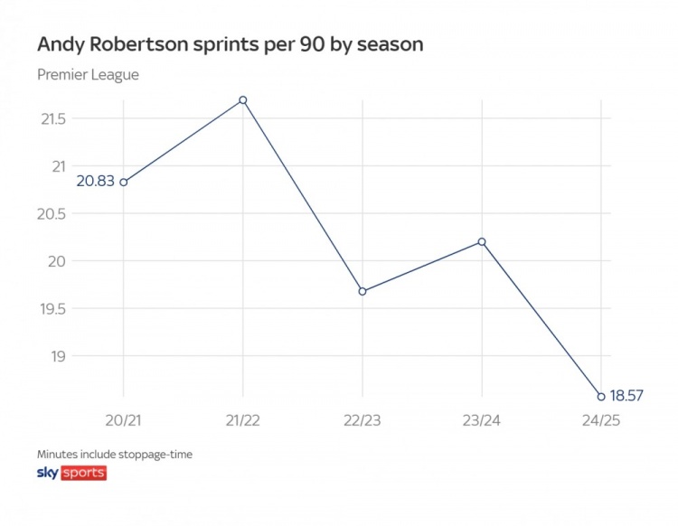 31岁的安德鲁-罗伯逊在加盟利物浦8年之后,赛场上的状态确实有了明显的下滑。上赛季,他在左路的抢断变得不再那么频繁——这也与他更偏保守的角色定位调整有关——同时从统计数据来看,他平均90分钟的冲刺次数与爆发速度也有明显的下滑。