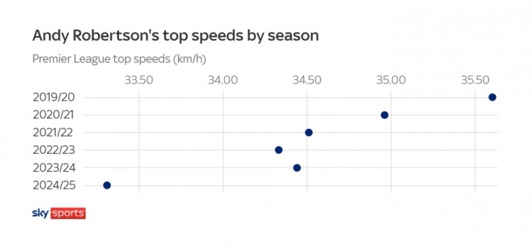 罗伯逊在英超的最高奔跑速度也有着明显的下滑