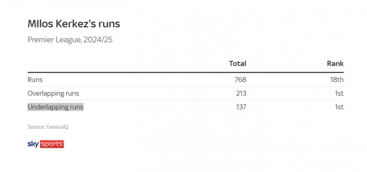 根据GeniusIQ统计数据,科尔克兹的套边跑动次数比任何其他英超球员都要多,达到了213次。